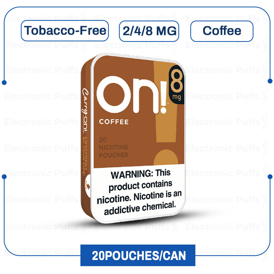 On! Coffee Mini Dry Nicotine Pouches has a taste of coffee. On! Coffee has a rich coffee flavor with a dry white mini pouch. It contains 20 pouches per can and is 100% Tobacco free. It uses plant derived nicotine crystals to deliver pure concentration in a small oral pouch format.