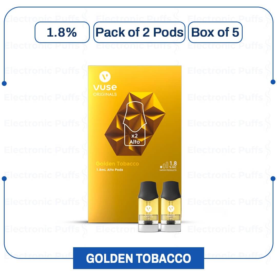 Vuse ALTO Golden Tobacco Pods give a smooth and mild tobacco taste. The flavor is light with a hint of sweetness. It mixes gentle earthy notes with a soft richness. These pods are good for users switching from cigarettes or who want lighter nicotine.