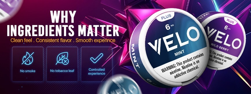 Nicotine is the main active ingredient in Velo Plus pouches. In many “Plus” versions, it’s often pharmaceutical-grade and sometimes synthetic rather than tobacco-derived.